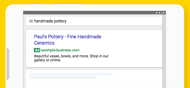 On PCs, tablets, and smartphones, if the words people type into Google match your keywords, your ad can appear above the search results. You only pay when people click — either to go to your website or to call your business. With millions of searches per day on Google, you can make sure your customers notice your brand, consider your offerings, and take action.